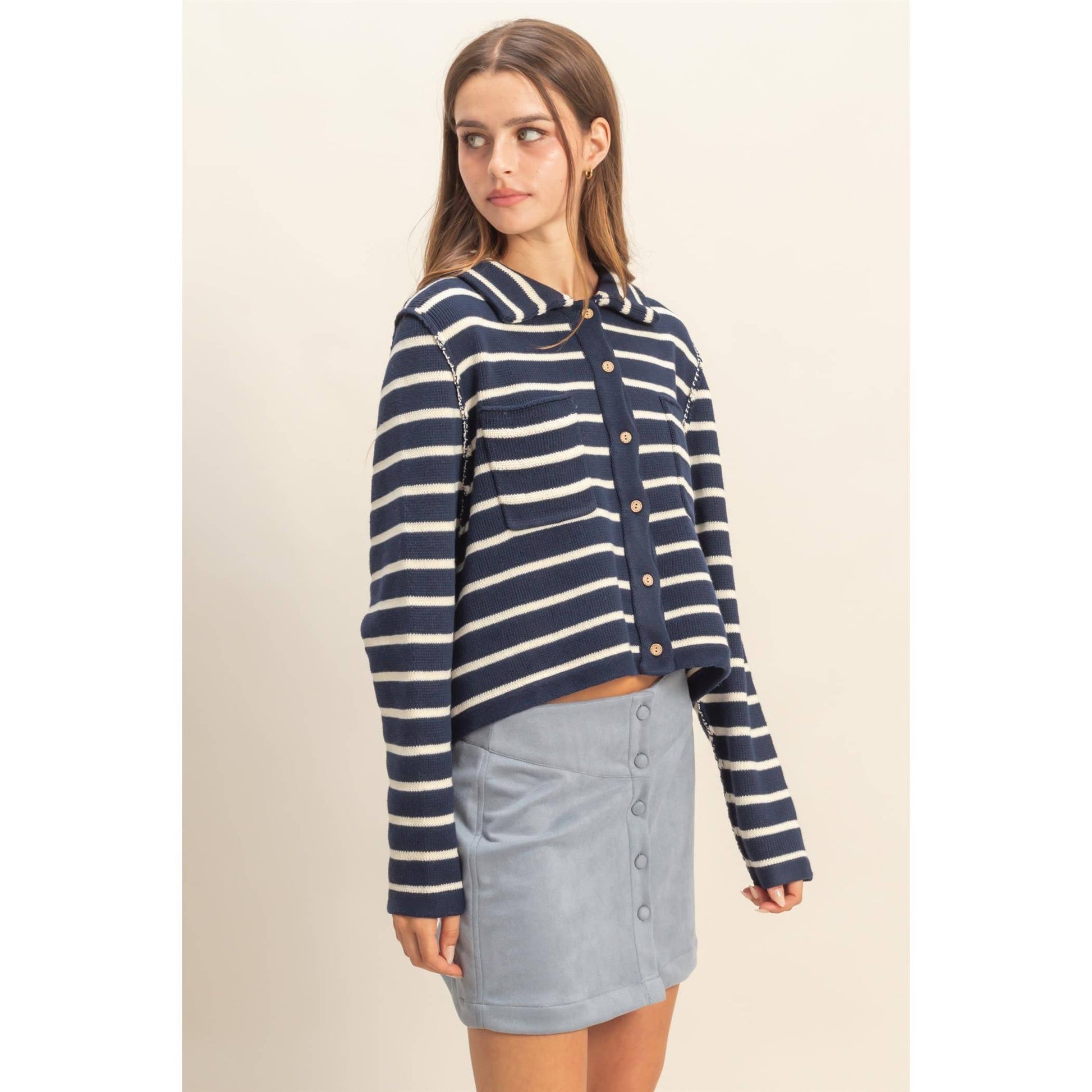 This cozy sweater features a button-down front, perfect for easy layering. Its classic striped pattern complements a relaxed silhouette, making it ideal for casual outings or comfortable home wear. Pair it with denim shorts for a timeless look or layer over a crisp shirt for added sophistication. 100% Polyester