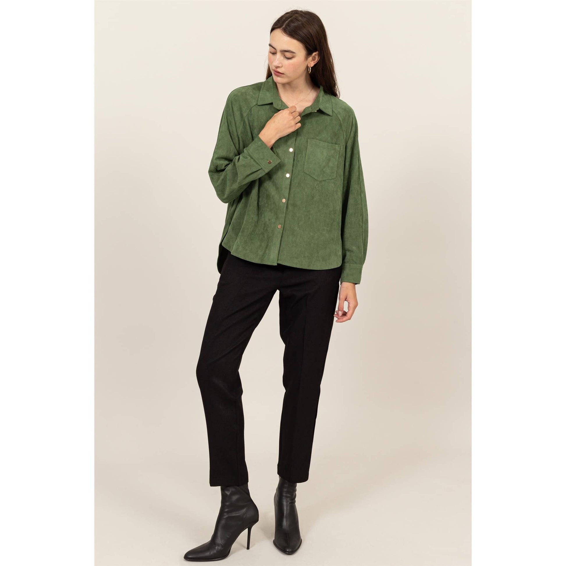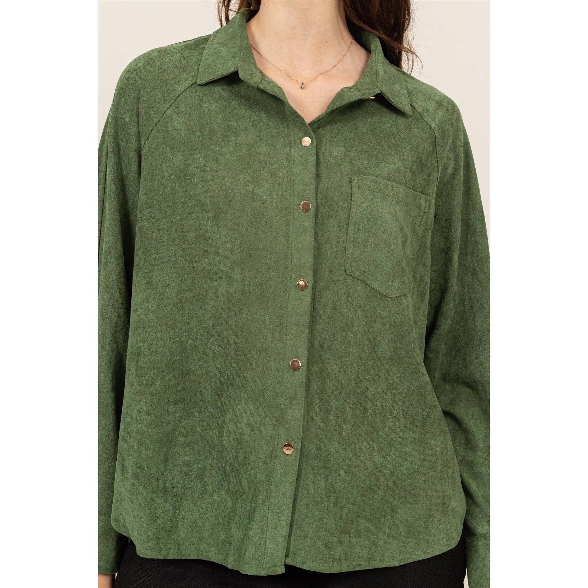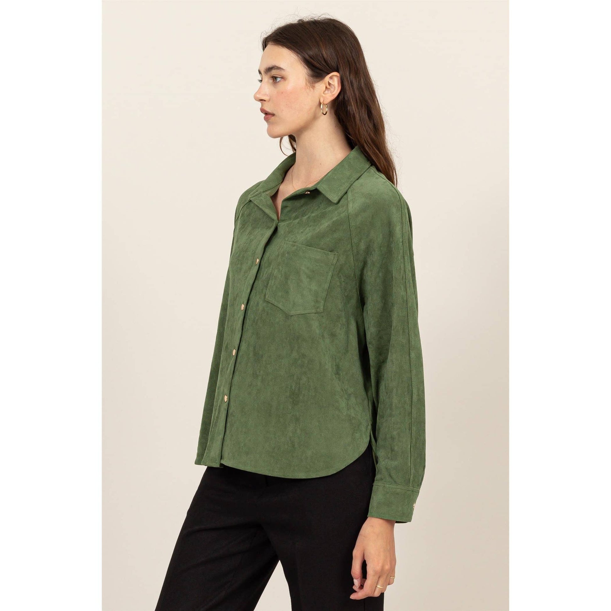 This button-up long sleeve shirt offers a perfect blend of casual comfort and effortless style. Designed with a classic collar and front pocket, this shirt adds a touch of sophistication to any outfit. The button-up front allows for easy wear and versatility, making it ideal for layering or wearing on its own. The soft fabric provides all-day comfort, while the relaxed fit ensures a flattering silhouette. Perfect for both work and leisure, this shirt is a wardrobe essential. 90% Polyester 10% Spandex